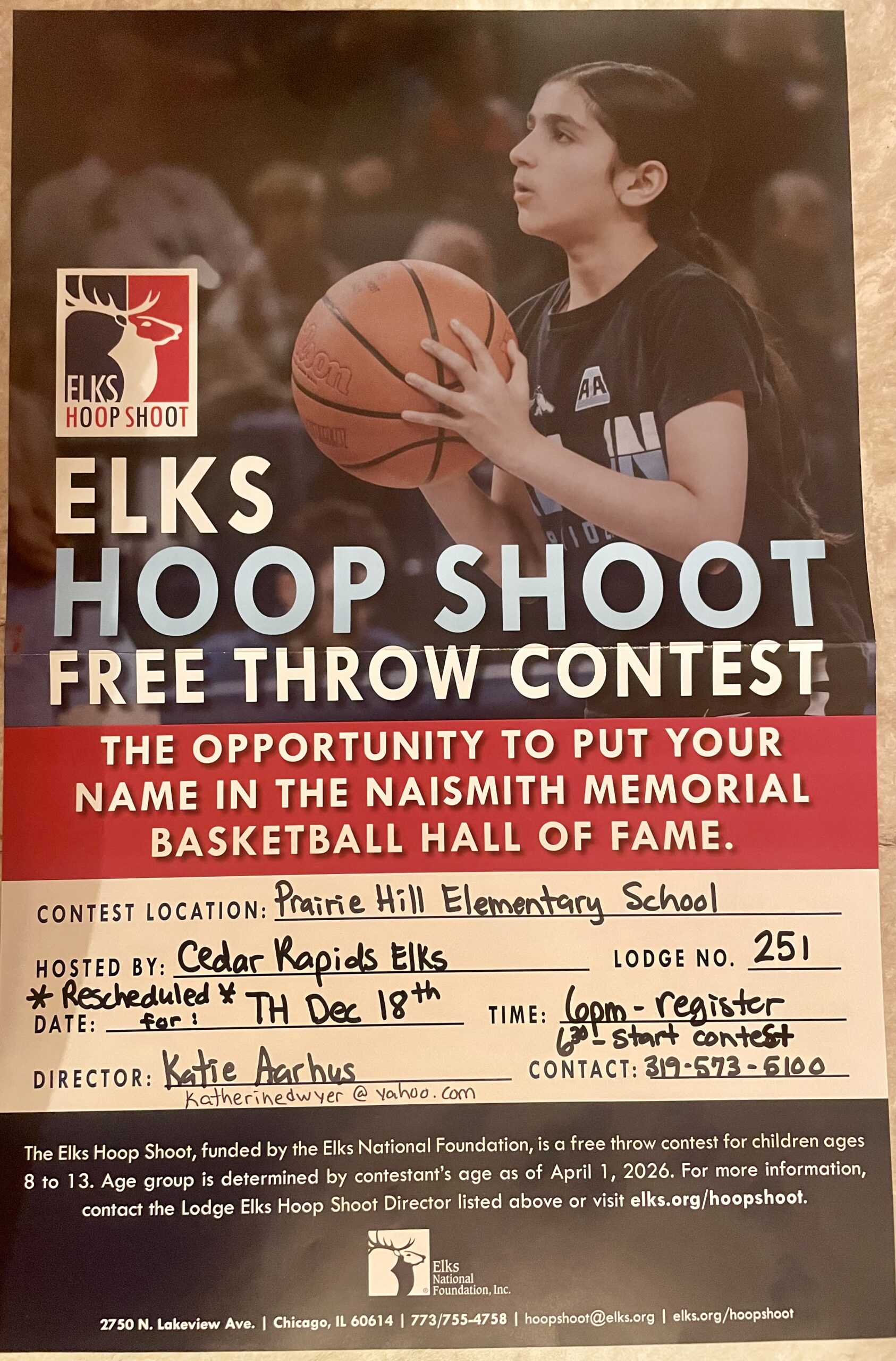 The Elks Hoop Shoot is an opportunity to compete in a free throw contest of 25 shots against other boys or girls their age (8-9, 10-11, and 12-13 years old on April 1, 2026). The first place finisher in each category will move on to the district contest in Charles City with a chance to advance through other competitions and all the way to Chicago. Registration starts at 6PM and the contest will start promptly at 6:30PM. This event was rescheduled from December 11 due to bad weather. If you have any questions, please call or text Katie at 319-573-5100.
