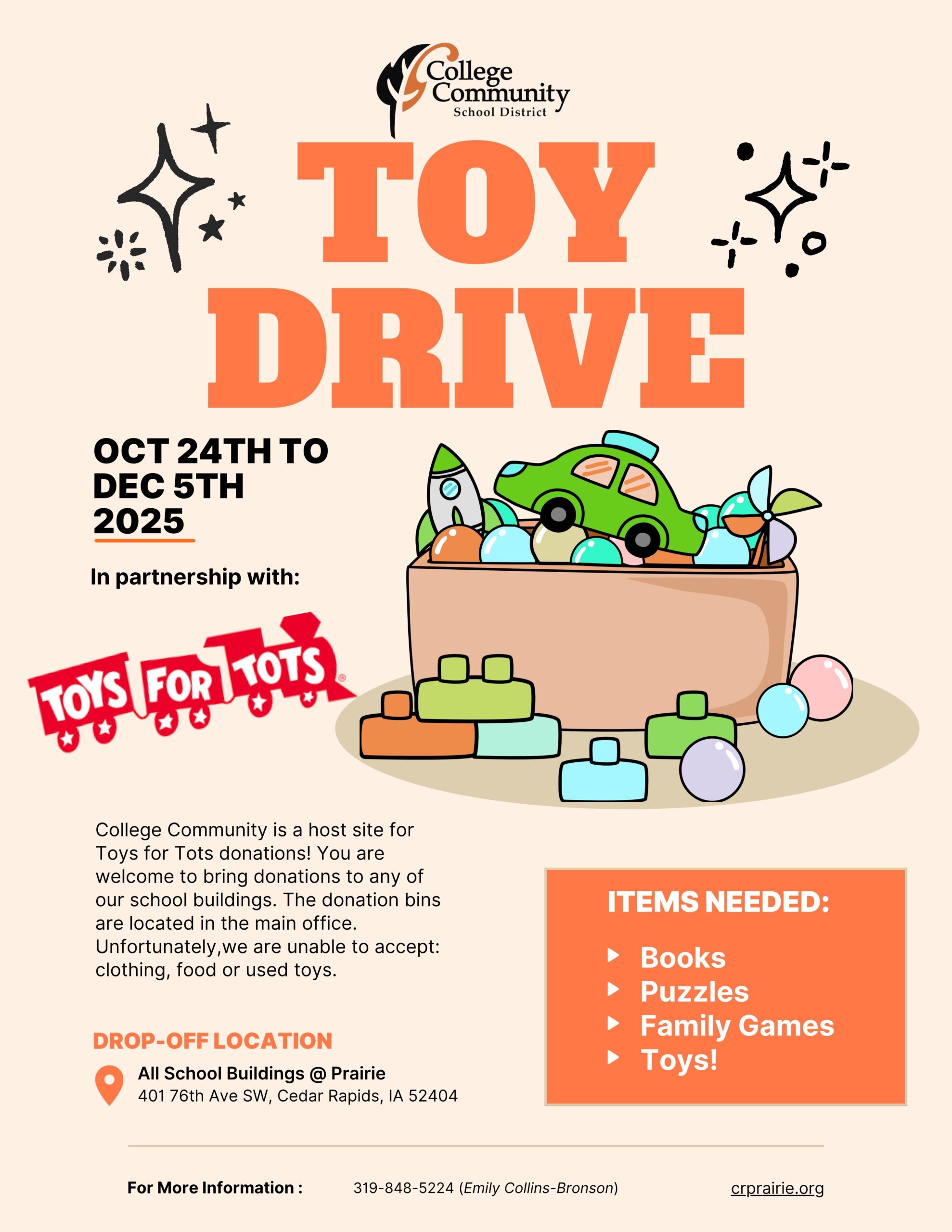 Information Toys for Tots – Linn County/Cedar Rapids 2025 Information College Community Schools is partnering with Toys for Tots this year! If you would like to donate new, unwrapped toys for local children, you can use any of our school buildings as a convenient drop-off location. Look for the donation bins near the main office in each school to leave your generous contributions. Thank you for helping us make the holidays brighter for children in our community! 2025 Family Registration Dates: October 20 through November 18 Family registrations are processed online by The Salvation Army of Cedar Rapids through the Angel Tree program. - TSA Home Page: https://centralusa.salvationarmy.org/cedarrapids/