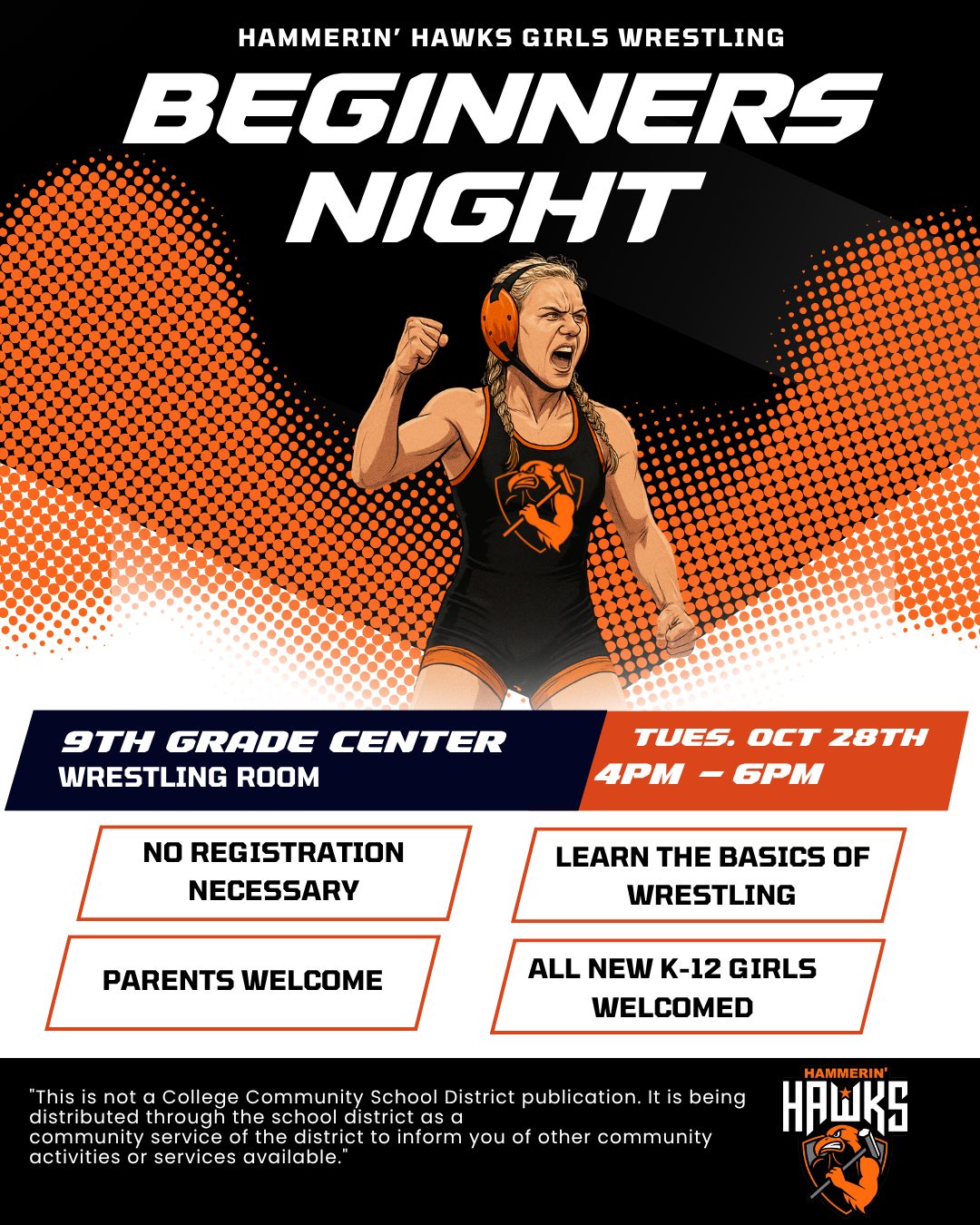 Information The Prairie Girls Wrestling team & the Hammerin’ Hawks Club will be hosting a Beginner Night next Tuesday, October 28th, 2025 from 4pm to 6pm in the 9th Grade Center Girls Wrestling Room. This is open to all girls K-12! This is the perfect opportunity to try wrestling before the season begins!! No cost or registration necessary, just show up!