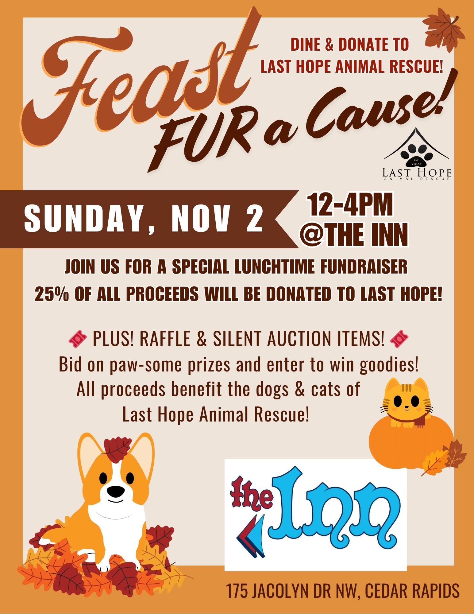 Information Join Last Hope Animal Rescue at The Inn Restaurant in Cedar Rapids on Sunday, November 2nd to Feast FUR a Cause from 12-4PM! The Inn will donate 25% of all proceeds during the event directly to Last Hope, they will also feature a terrific selection of raffle and silent auction items that you can bid on to win that day! Make plans to join us between 12-4PM and be sure to come HUNGRY! The Inn features the best Broaster chicken, pizza, tenderloins and MORE!