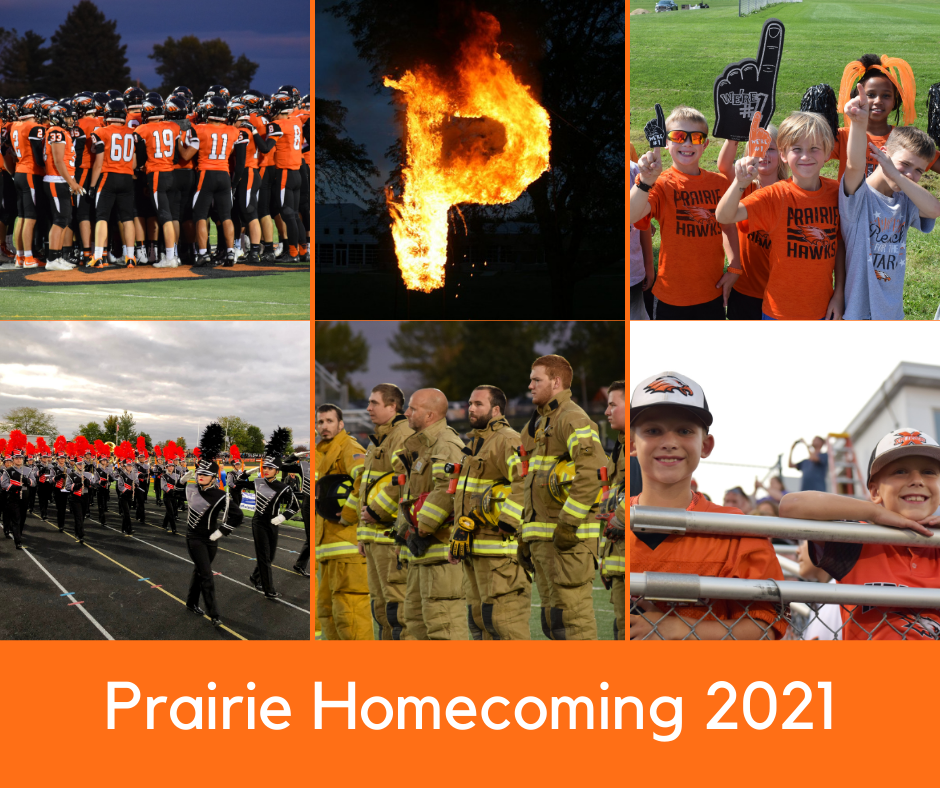 Prairie’s 2021 Homecoming will be held on Friday, September 17 where the Hawks will play Bettendorf. Festivities will include a campus-wide parade which will start at 1:45 PM. Evening activities include the announcement of our homecoming court, King and Queen, Grand Marshals, the lighting of the P and the pregame tradition of honoring our First Responders. Download the Prairie Homecoming Map: Prairie Homecoming 2021 Parade Route