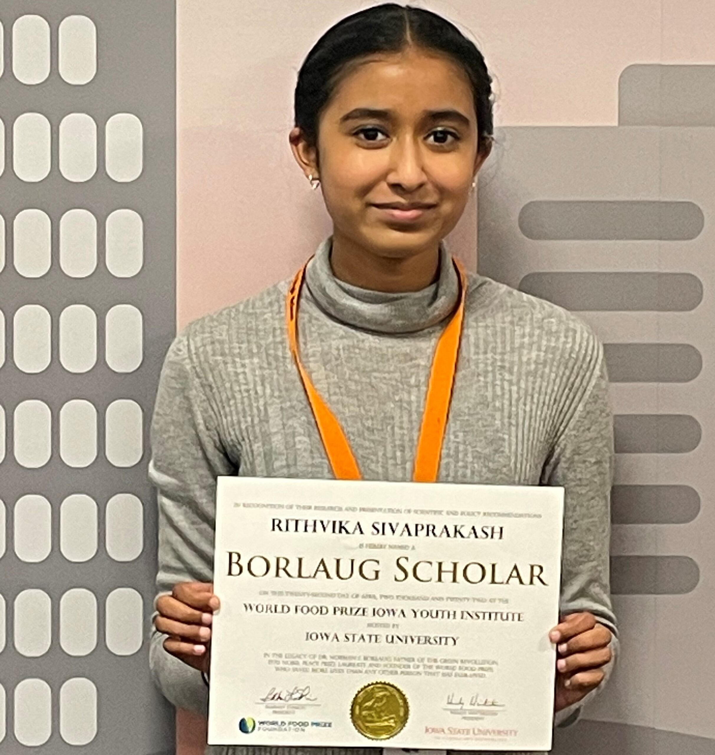 Rithvika Sivaprakash, a junior at Prairie High School participated in this year’s virtual World Food Prize Iowa Youth Institute on April 22, 2022. She presented her research related to food security on Dalit women and India’s hunger crisis to a panel of experts, teachers, and peers. She has been named a Borlaug Scholar and has won a $1,000 scholarship to Iowa State University in the College of Agriculture and Life Science. Congratulations Rithvika!