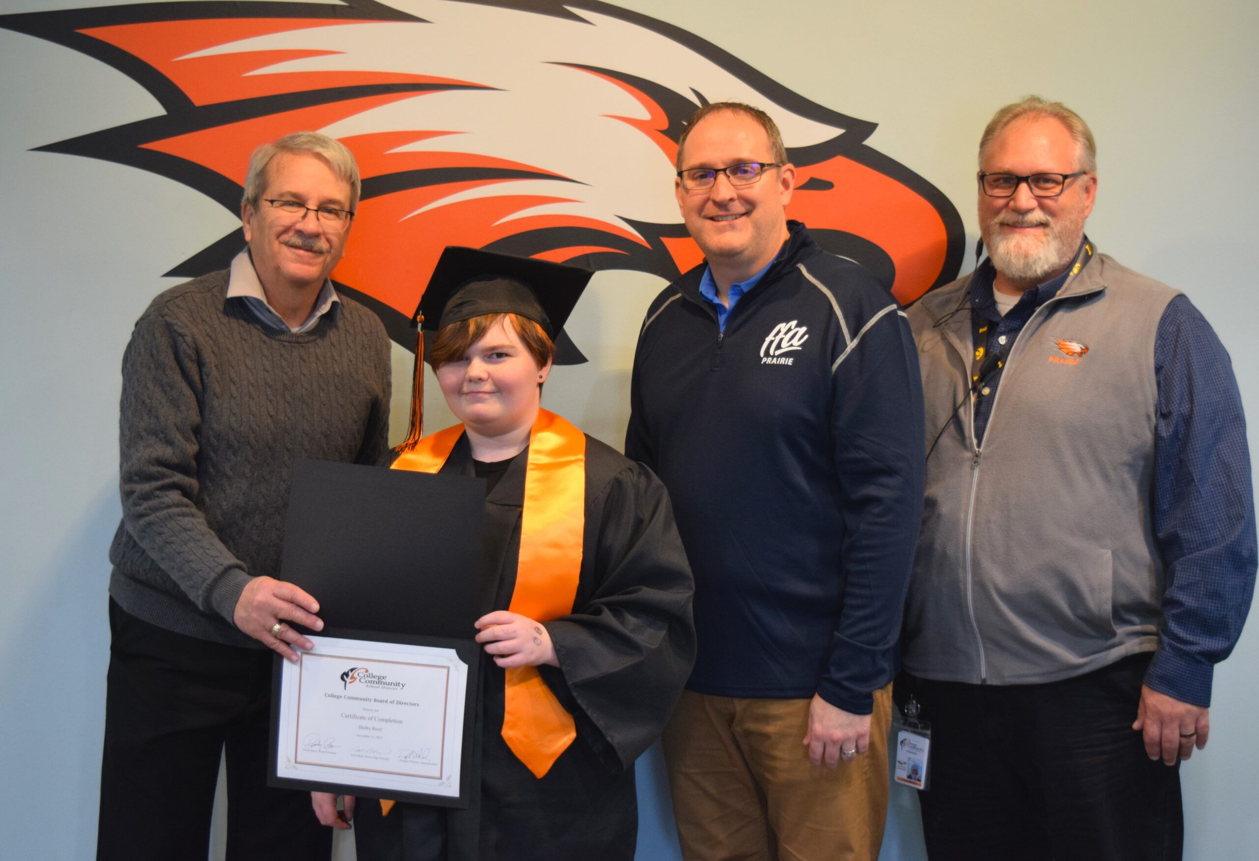 L-R School Board President Randy Bauer, Graduate Shelby Reed, Superintendent Dr. Doug Wheeler, Prairie Edge Principal Scott Black